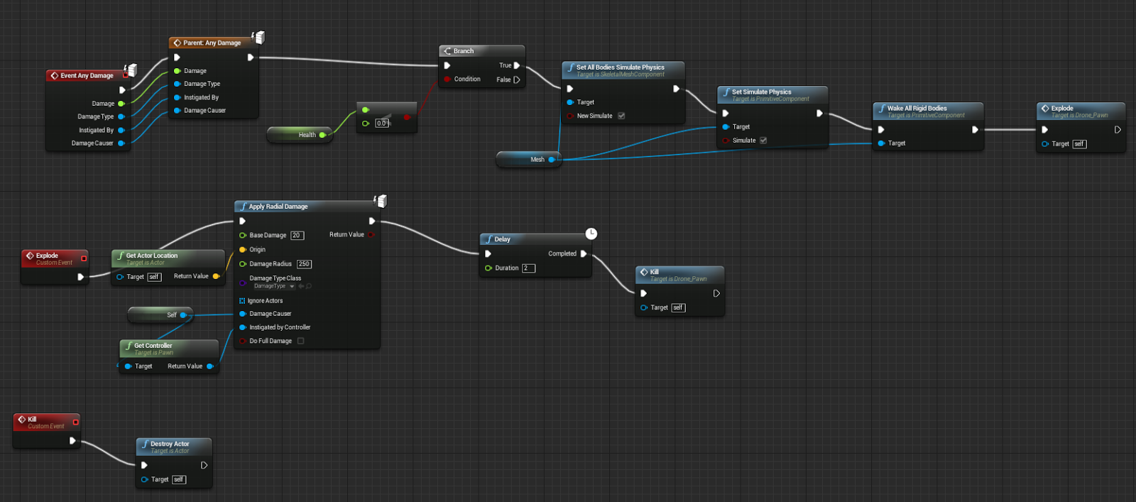 Now when you kill Drone it will create radial damage and make damage to all other's enemies in radius. Unreal is making the magic where if enemy is near the explosion it will get more damage.